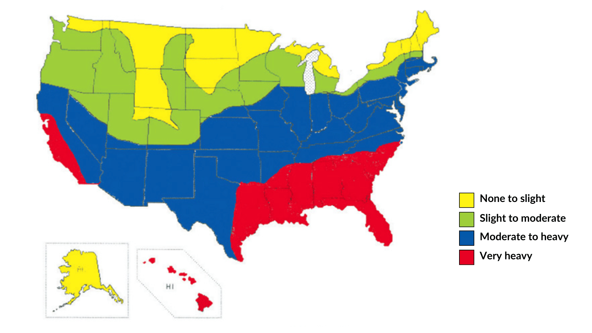Termites are found in almost every area of the United States. However, they are more prevalent in certain areas, and most of the damage termites cause comes from subterranean termites. We can reference the U.S. Subterranean Termite Distribution map to see where the termite threat is greatest.